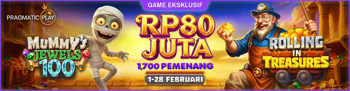 Cash drop Game Eksklusif oleh Pragmatic Play untuk Mummy's Jewels 100 dan Rolling in Riches akan berlangsung mulai 1 Februari 2026 hingga 28 Februari 2026 setiap hari dari pukul 00:00 WIB - 23:59 WIB. Total hadiah cash drop sebesar RP 80,000,000 akan dibagikan kepada 1.700 pemain beruntung.